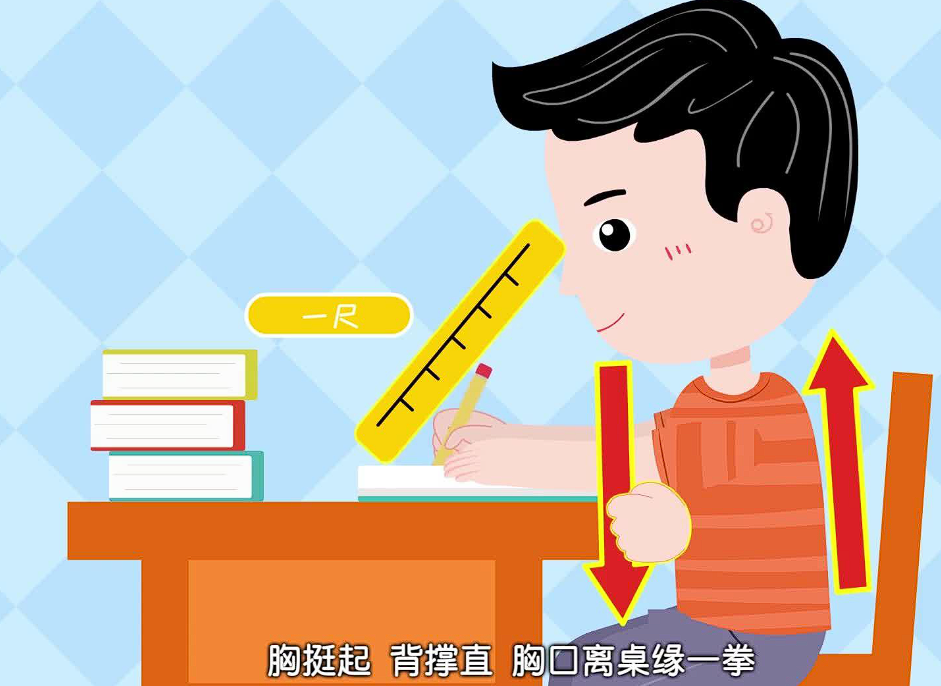 即“一尺一拳一寸”,眼離書本一尺(33厘米左右),胸距書桌一拳(一個(gè)拳頭的距離),手離筆尖一寸(約3厘米)。不可平躺、側(cè)躺或趴在床上看書,不可邊走邊看書,或者在移動(dòng)的車廂內(nèi)看書。