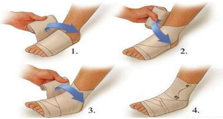 受傷的踝關(guān)節(jié)以繃帶包扎,以減少出血腫脹,但須注意包扎的力道與松緊程度,絕對不可因包扎過緊而影響到下肢的循環(huán)。