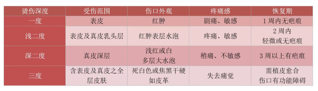 I度損傷最輕,僅傷及表皮淺層, 表現(xiàn)為局部發(fā)紅、燒灼感,3-7天后愈合,不留疤痕;