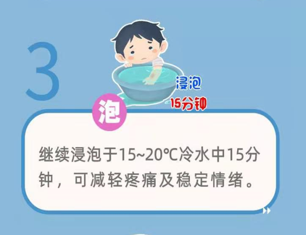 泡:用毛巾局部冷敷或把燙傷部位浸泡在冷水中,這么做可減少疼痛、減輕傷情。但切勿用冰塊直接接觸到皮膚,以免進一步加重皮膚損傷。
