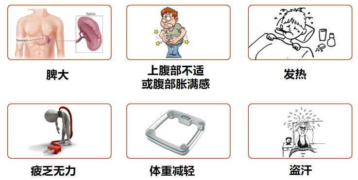 接近一半的患者在就診時(shí)無(wú)癥狀,多在體檢時(shí)被發(fā)現(xiàn)。CML是一種慢性疾病,癥狀不典型,如不治療會(huì)逐漸加重。主要表現(xiàn)如下: